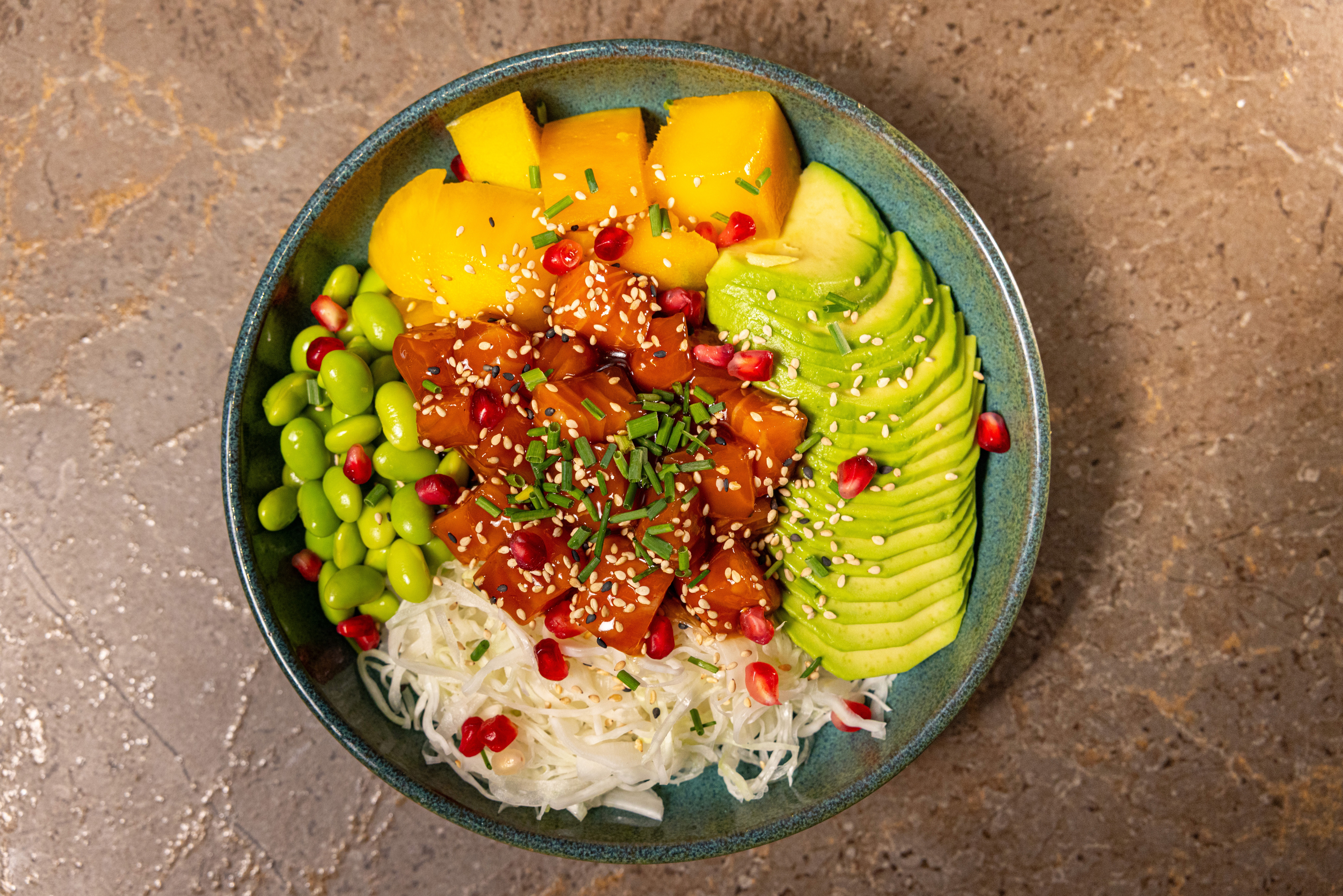 Dés de saumon, riz vinaigré, avocat, chou mariné, edamame, mangue, grenade, sésame torréfié, ciboulette et sauce teriyaki